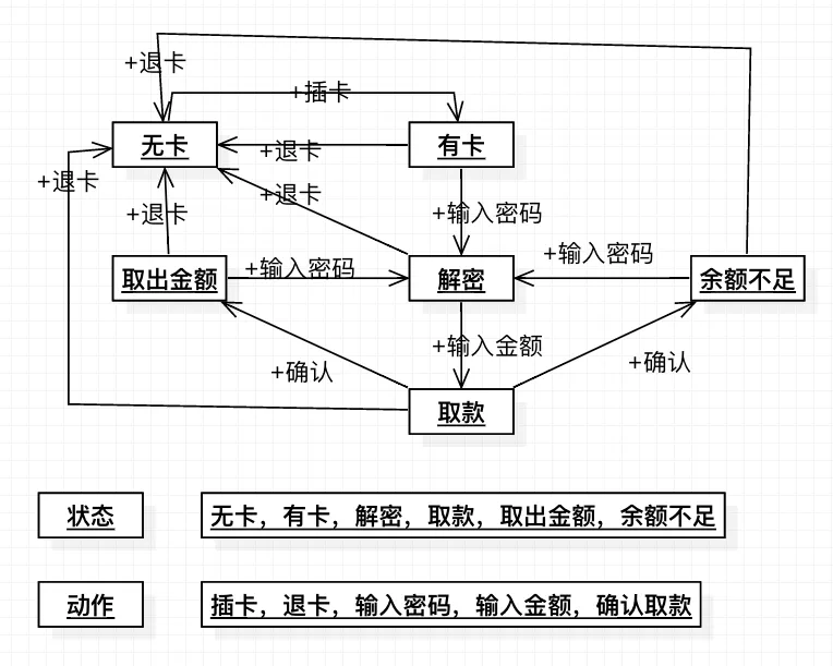 首先我们先对ATM机的各种状态,下方就是我们所画出的类“状态图”。每个方框就是一种状态,而我们的ATM机大致分为无卡,有卡,解密,取款,取出金额,余额不足这六种状态,也就是下方“状态图”中方框中的内容。然后就是动作了,每种状态间的转化我们需要动作才可以完成。在我们的ATM机中大致分为插卡,退卡,输入密码,输入金额,确认取款这几种动作。状态间转换时所需的动作关系如下所示。因为该部分实现的代码位于一个类中,再扯就不做过多的赘述了。