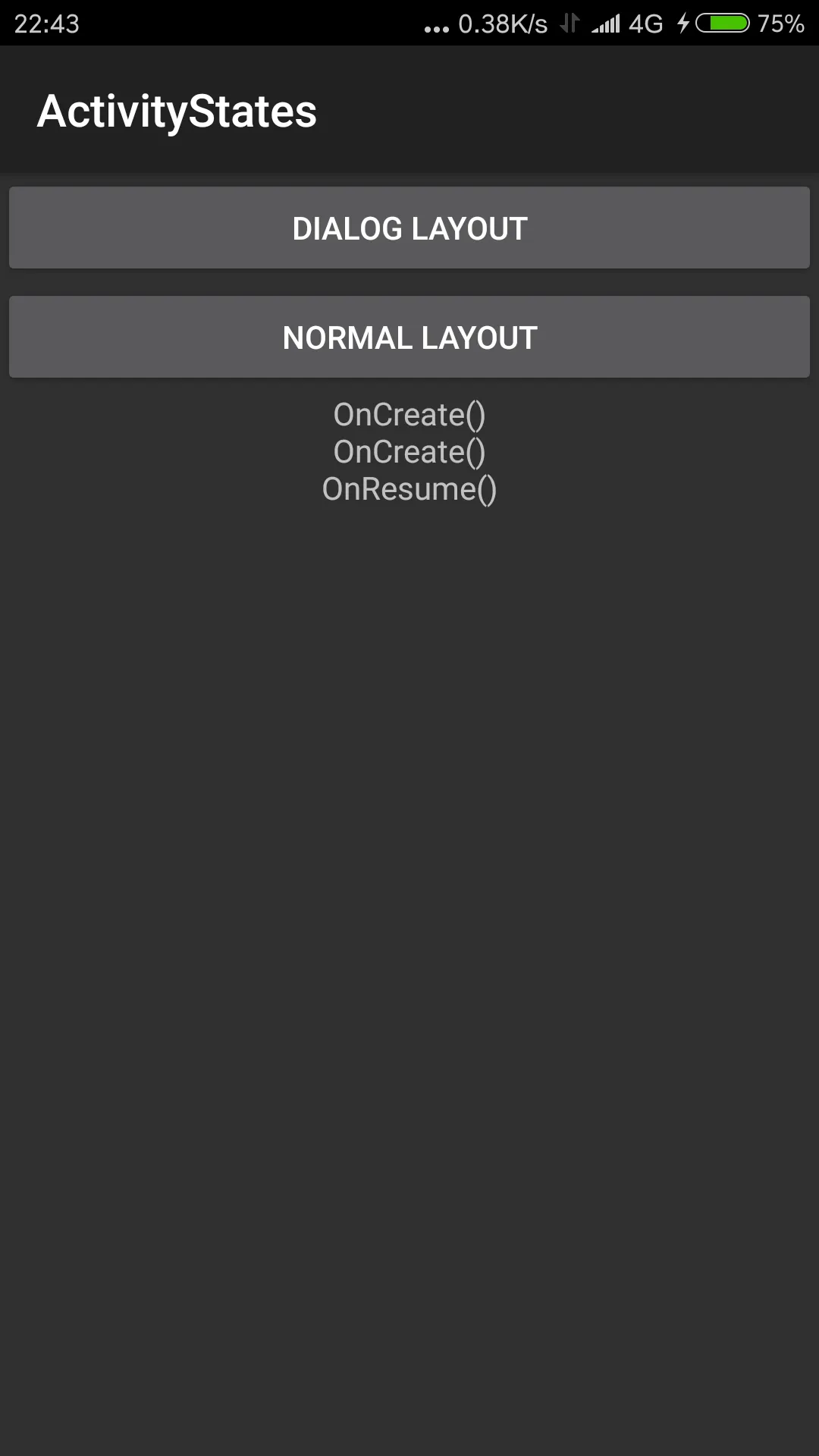 <LinearLayout xmlns:android="http://schemas.android.com/apk/res/android" android:orientation="vertical" android:layout_width="match_parent" android:layout_height="match_parent"> <Button android:text="Dialog Layout" android:layout_width="match_parent" android:layout_height="wrap_content" android:id="@+id/btnDialog" /> <Button android:text="Normal Layout" android:layout_width="match_parent" android:layout_height="wrap_content" android:id="@+id/btnNormal" /> <TextView android:gravity="center" android:layout_width="match_parent" android:layout_height="wrap_content" android:id="@+id/txtLog" /> </LinearLayout>