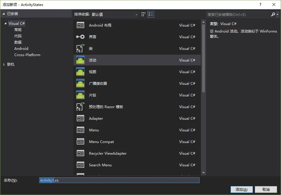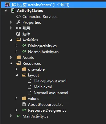 新建一个 Xamarin.Android 项目 ActivityStates。在项目中新建文件夹 Activities 用来存放活动。项目结构如下