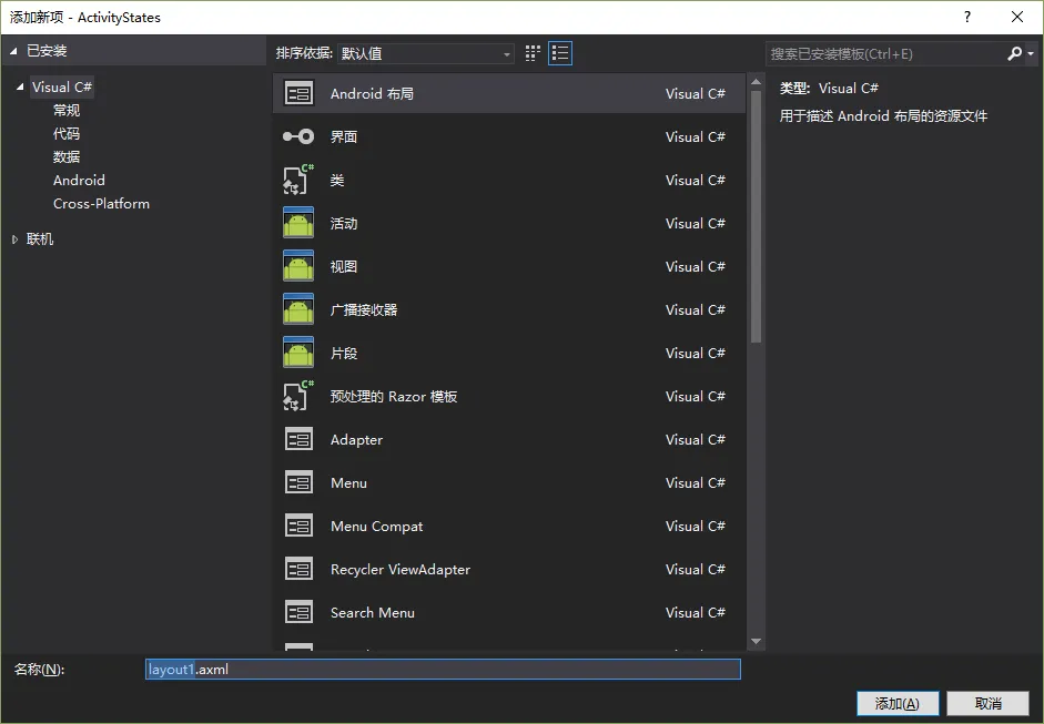 在 Resources 下的 layout 文件夹中新建两个与之相对应的布局 DialogLayout.axml 和 NormalLayout.axml(右击 layout —— 添加 —— 新建项 —— Android 布局)