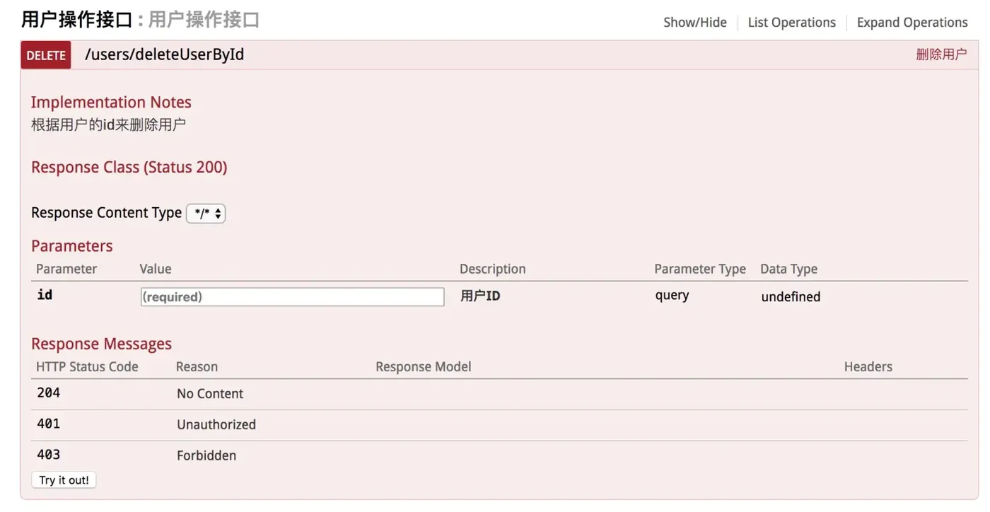 @ApiImplicitParam(name = "id", value = "用户ID", required = true,paramType = "query", dataType = "Integer")