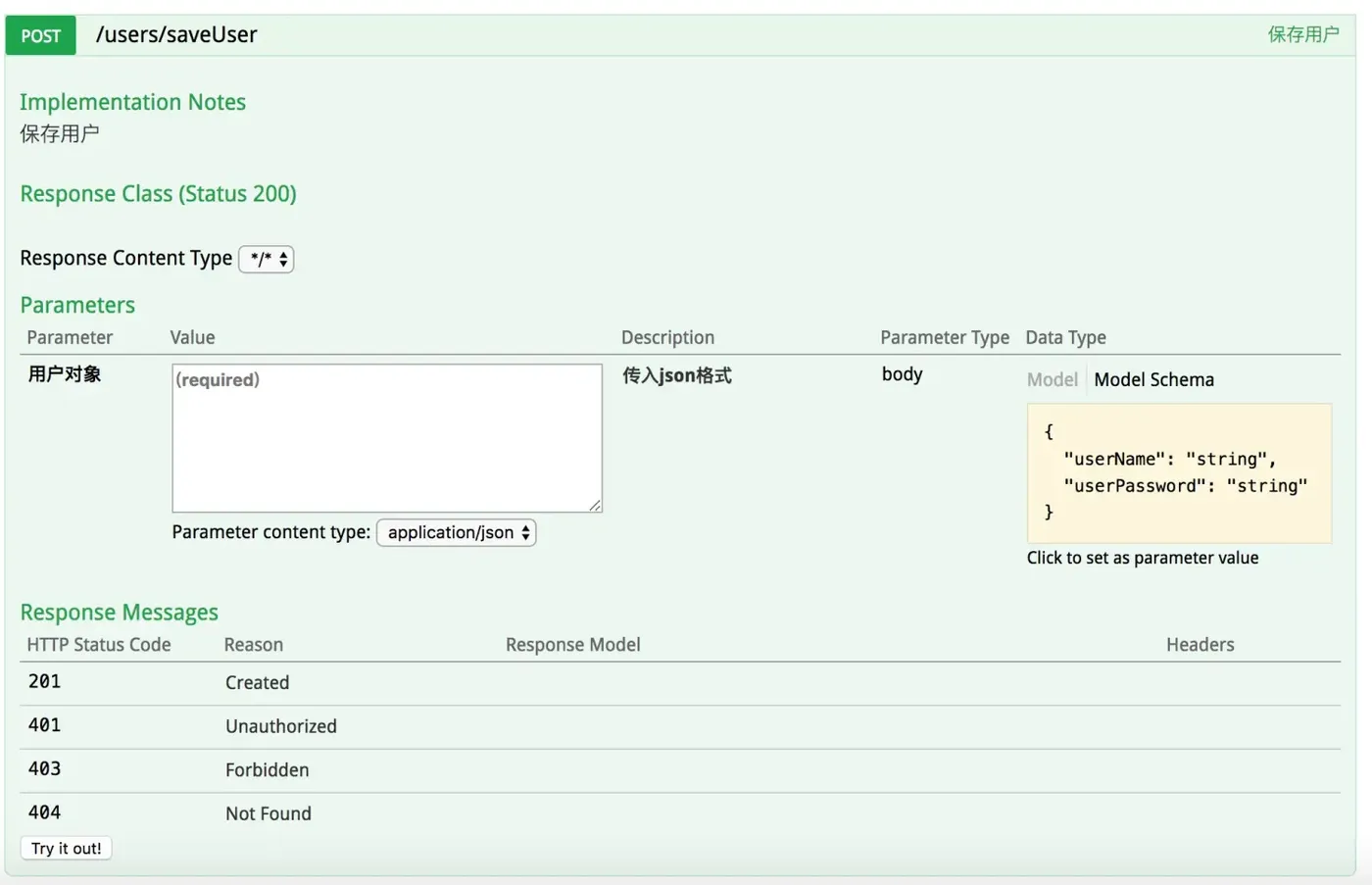 public String saveUser(@RequestBody @ApiParam(name="用户对象",value="传入json格式",required=true) User user){