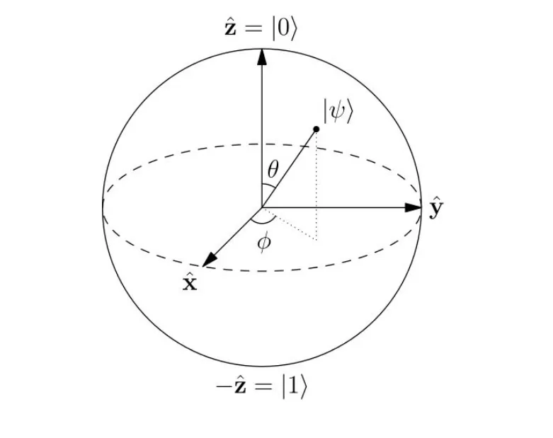 如下图,该球(Bloch球)表面的每一点都是|0>和|1>的叠加态(不同点未来在测量的时候坍缩到某一态的概率不同),当我们对量子态进行操作时,它按照量子力学的规律绕某个轴转动,绕不同的轴转动就可以到达球面任意点,这种操作下|0>和|1>是同时变化的,这就是并行处理。