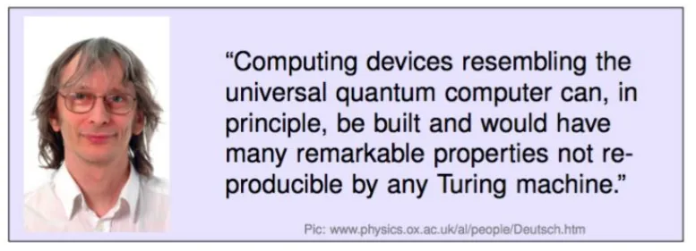 Deutsch 在 1985 年对这一想法进行了形式化, 他令人惊讶地展示了一个量子计算机与经典计算机相比存在优势的例子 (计算两比特的异或), 当然, 这个问题在表面上似乎和量子力学并没有什么关系. 很快一系列能有效加速算法被提出, 但都是针对人为设计的问题. 直到 1994 年, Peter Shor 提出了多项式时间的整数分解算法.