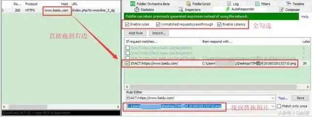 在右上角选择AutoResponder页签,勾选Enable rules、Unmatched requests passthrough 两个选项,点击Add rule 按钮,在下方填写替换的规则,编辑好之后,点击保存。