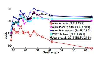 有了注意机制,我们可以处理序列中的 30, 40, 80+个标记。下面是一个描述 BLEU 的图片,其中包含或不包含注意机制: