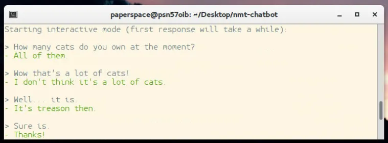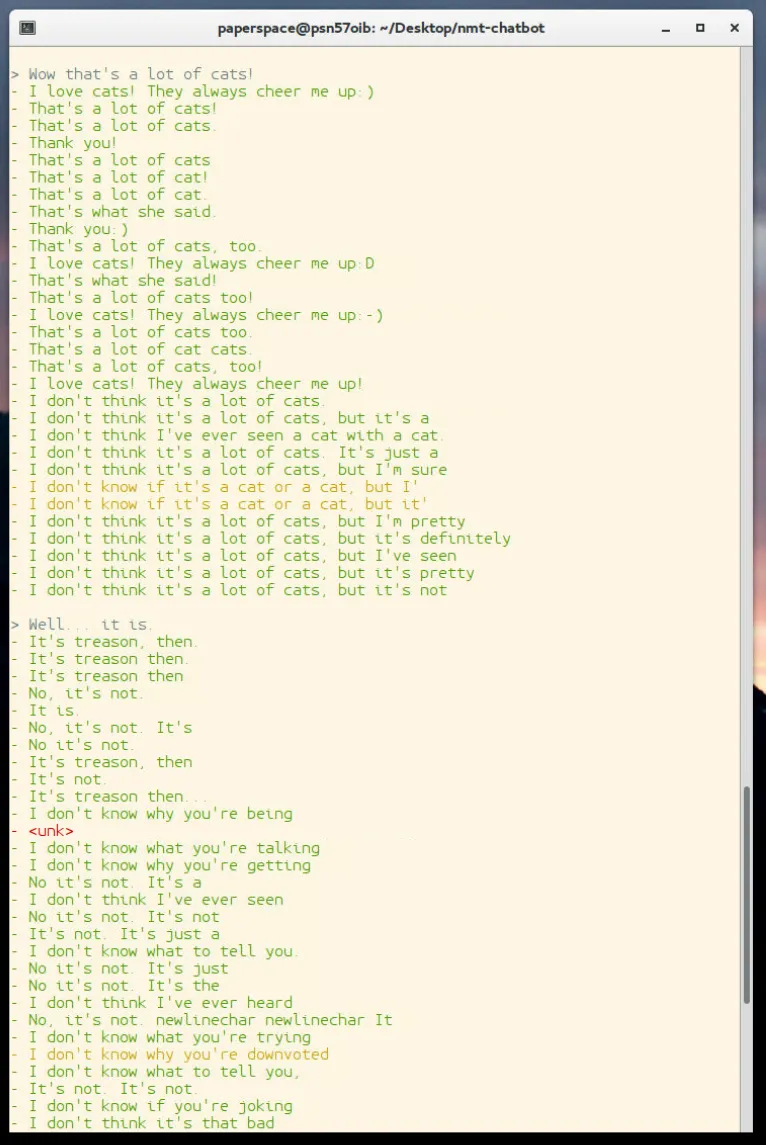 除了每隔 1000 步保存检查点外,我们还会做一些更多的示例(来自我们的tst.to和tst.from文件)。 这些数据每千步输出一次,并进入模型目录以及output_dev和output_test。 你可以使用这些文件查看每隔 1000 个步骤在控制台中完成的单个示例。 这些输出文件纯粹是测试文件的,顶级输出语句的结果响应。 既然你可以在你的测试文件中添加你想要的任何示例,那么这是你可以与聊天机器人进行交互的第一种方式,或者至少可以看到交互。 我写了一个简单的配对脚本,来输出测试文件和输出文件的评论响应偶对。