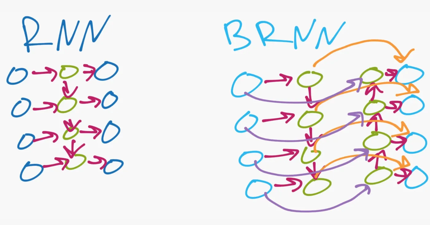 在简单的RNN上,你有输入层,你的输出层,然后我们只有一个隐藏层。然后,你从输入层连接到隐藏层,隐藏层中的每个节点也向下传递到下一个隐藏层节点,这就是我们如何得到我们的“时间”,以及来自循环神经网络的非静态特性,因为之前的输入允许在隐藏层上向下和向下传播。相反在 BRNN 上,你的隐藏层由相反方向的节点组成,所以你有输入和输出层,然后你会有你的隐藏层。然而,与基本的 RNN 不同,隐藏层向上和向下传递数据(或者向前和向后传递,取决于谁在绘制图片),这使得网络能够基于历史上发生的事情,以及我们传给序列的未来发生的事情,理解发生了什么。