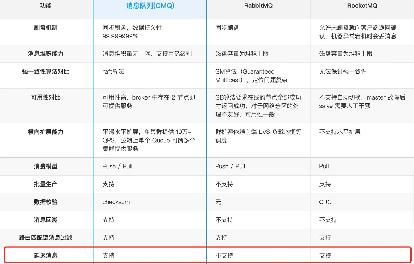 上图是CMQ中对MQ功能的对比,其中标明腾讯的CMQ支持延迟消息,但是没有具体写明支持到什么精度,支持任意时间还是特定的Level。