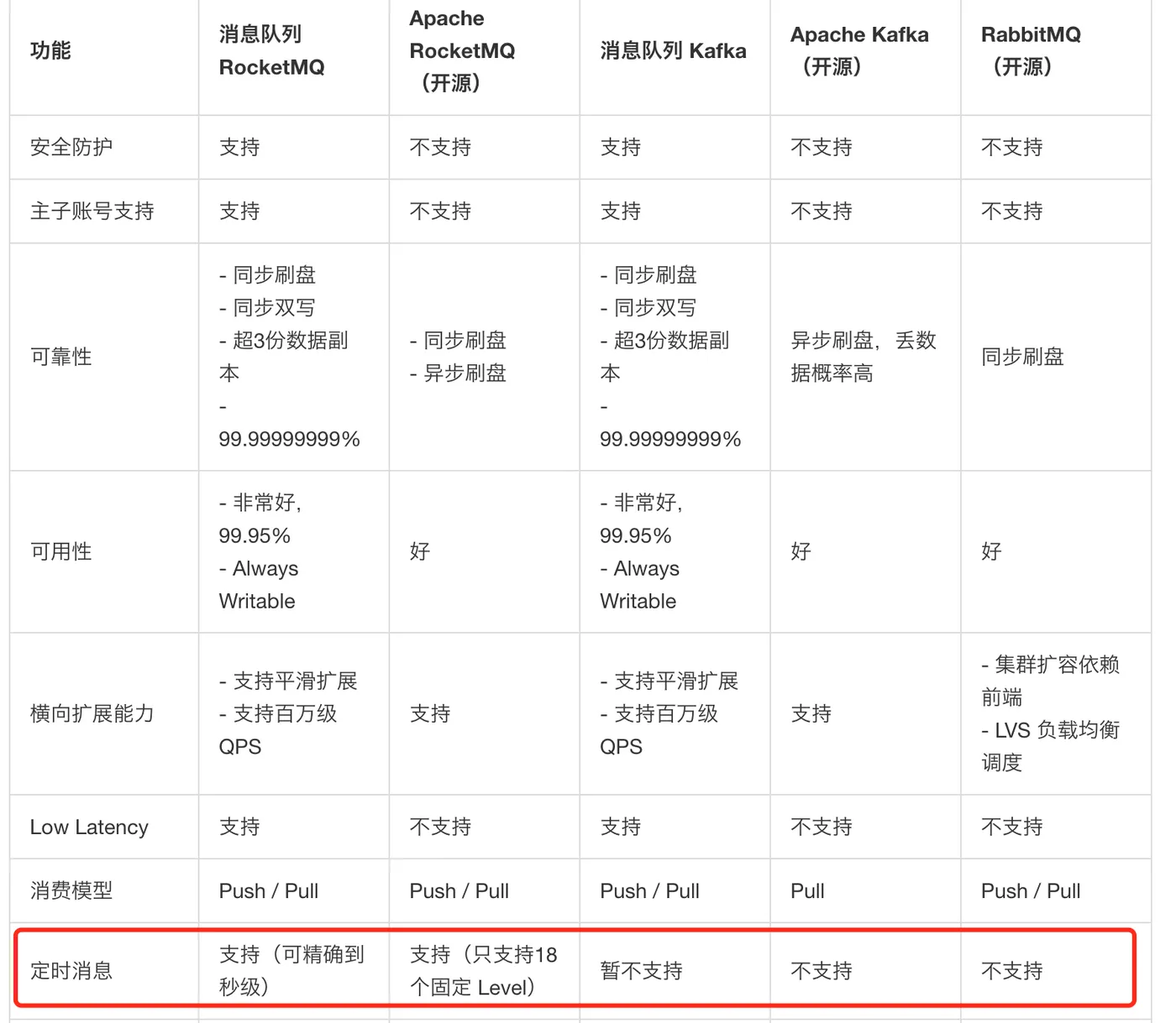 上图是阿里云上对业界MQ功能的对比,其中开源产品中只有阿里的RocketMQ支持延迟消息,且是固定的18个Level。