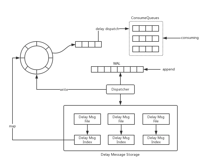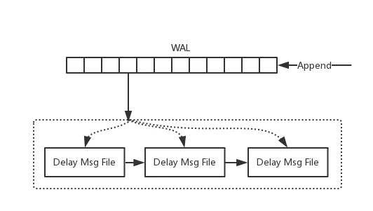 通过DispatchService将WAL中的延迟消息写入到独立的文件中。这些文件按照延迟时间组成一个链表。