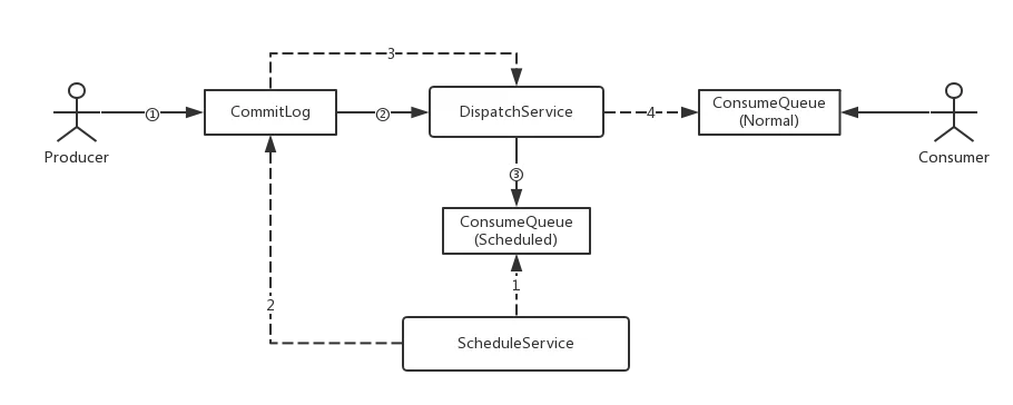 因为在第①步中Topic和QueueId被替换了,所以写入的ConsumeQueue实际上非真正消息应该所属的ConsumeQueue,而是写入到ScheduledConsumeQueue中(这个特定的Queue存放不会被消费)