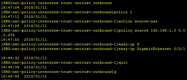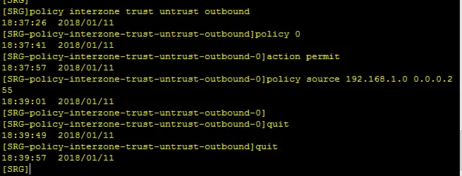 6、部署域间包过滤规则(policy interzone trust untrust outbound; policy 0; action permit; policy source 192.168.1.0 0.0.0.255;)