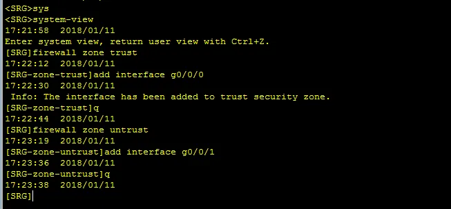 3、将接口放入安全区域(firewall zone trust; set priority 85;add interface GigabiEthernet0/0/0; firewall zone untrust; set priority 5; add interface GigabiEthernet0/0/1)
