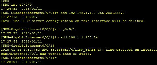 4、设置ip地址实现直连连通(interface GigabiEthernet0/0/0; undo shutdown; ip address ip 192.168.1.100 255.255.255.0; interface GigabiEthernet0/0/1; undo shutdown; ip address 192.168.1.100 255.255.255.0;)