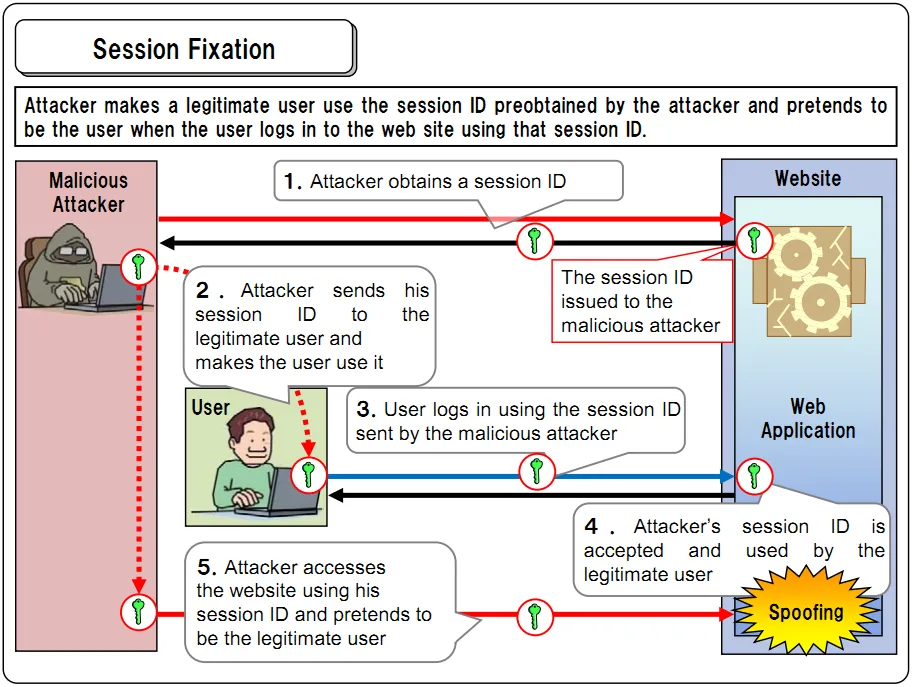其次是session fixation攻击。session fixation攻击是指用户通过XSS、网络嗅探、本地木马来得到特征值,这些交互的特征值一般来说放置在浏览器的Cookie中(当然,我们也知道sessionid也可以通过URL来传递,这样的话,获取就简单多了)。然后诱使用户去完成一次登录(诱使的方法可使发邮件,发链接等)。如果服务器没有更新这个SessionID,则攻击者可以凭借此SessionID登录系统,如图所示: