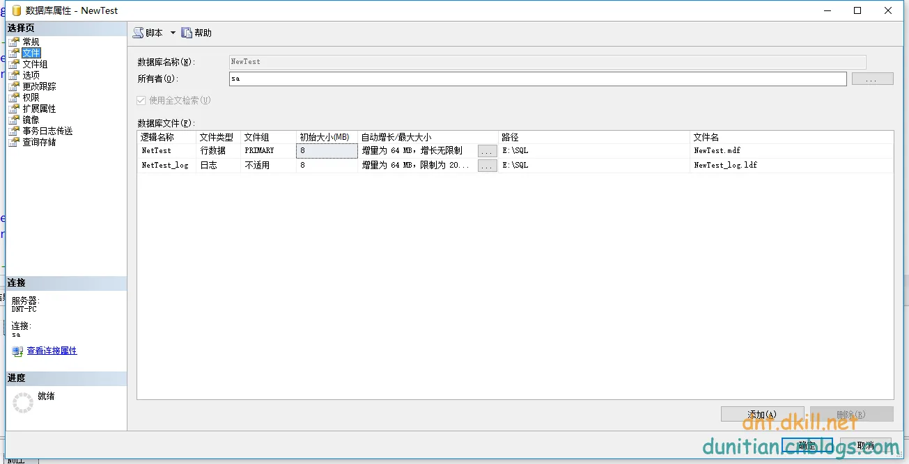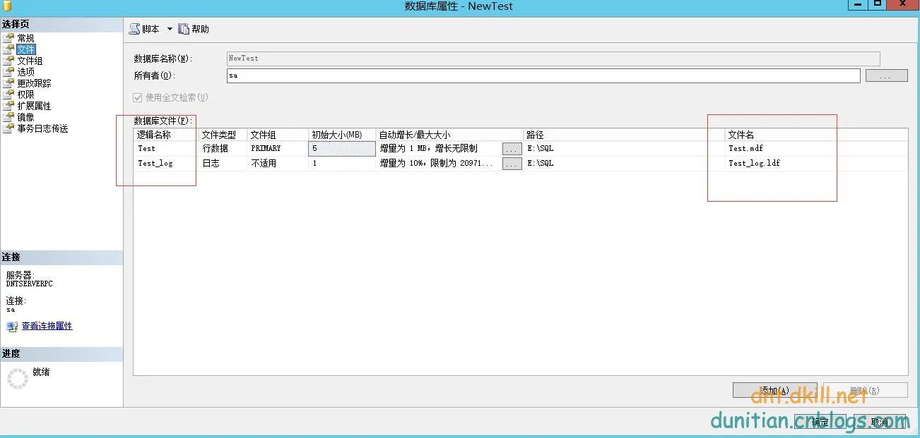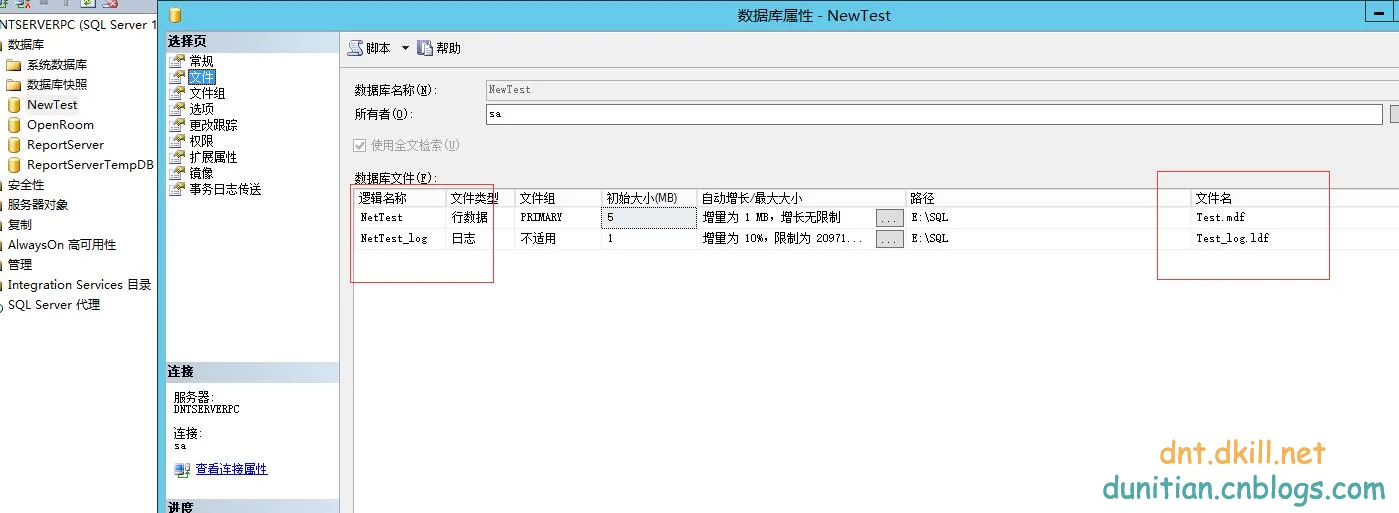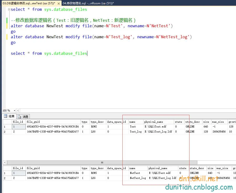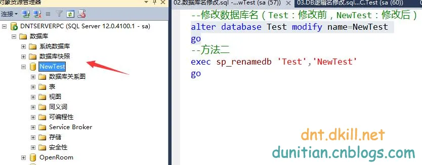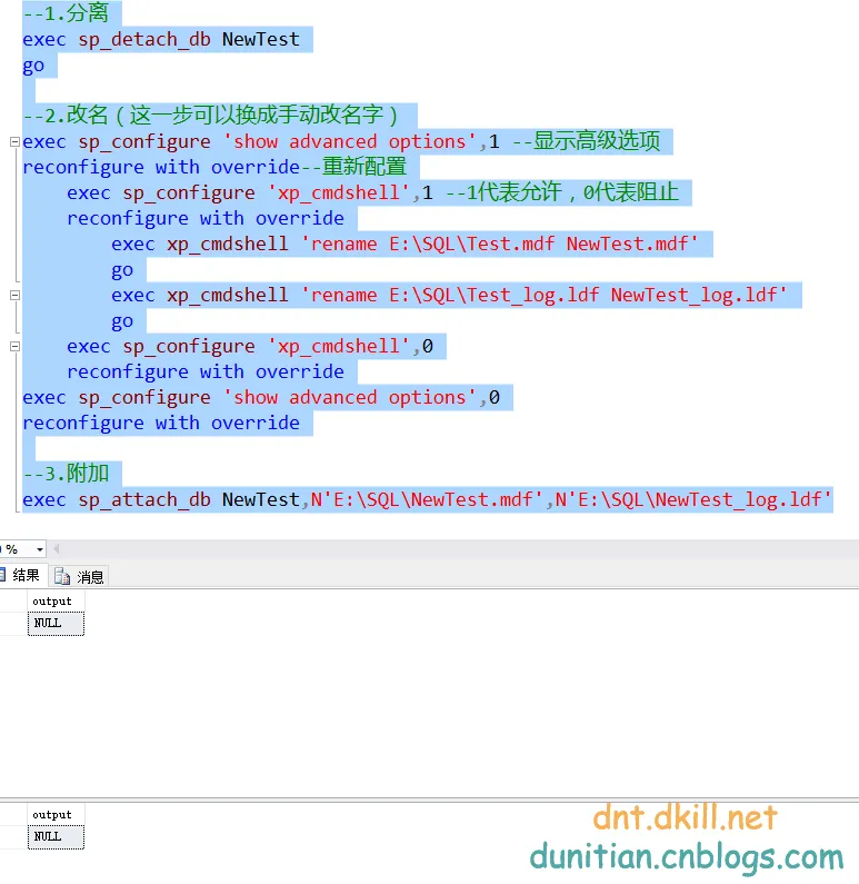 use master go --1.分离 exec sp_detach_db NewTest go --2.改名(这一步可以换成手动改名字) exec sp_configure 'show advanced options',1 --显示高级选项 reconfigure with override--重新配置 exec sp_configure 'xp_cmdshell',1 --1代表允许,0代表阻止 reconfigure with override exec xp_cmdshell 'rename E:\SQL\Test.mdf NewTest.mdf' go exec xp_cmdshell 'rename E:\SQL\Test_log.ldf NewTest_log.ldf' go exec sp_configure 'xp_cmdshell',0 reconfigure with override exec sp_configure 'show advanced options',0 reconfigure with override --3.附加 exec sp_attach_db NewTest,N'E:\SQL\NewTest.mdf',N'E:\SQL\NewTest_log.ldf'