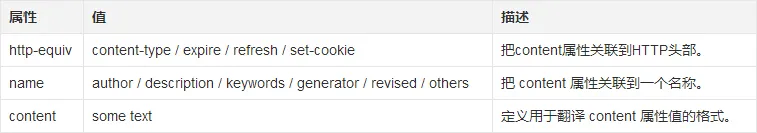 标签提供关于HTML文档的元数据。元数据不会显示在页面上,但是对于机器是可读的。它可用于浏览器(如何显示内容或重新加载页面),搜索引擎(关键词),或其他web 服务。 ——W3School