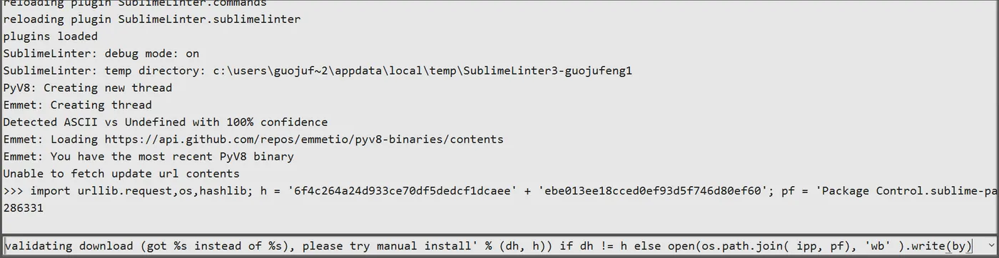 1 import urllib.request,os,hashlib; h = '6f4c264a24d933ce70df5dedcf1dcaee' + 'ebe013ee18cced0ef93d5f746d80ef60'; pf = 'Package Control.sublime-package'; ipp = sublime.installed_packages_path(); urllib.request.install_opener( urllib.request.build_opener( urllib.request.ProxyHandler()) ); by = urllib.request.urlopen( 'http://packagecontrol.io/' + pf.replace(' ', '%20')).read(); dh = hashlib.sha256(by).hexdigest(); print('Error validating download (got %s instead of %s), please try manual install' % (dh, h)) if dh != h else open(os.path.join( ipp, pf), 'wb' ).write(by)
