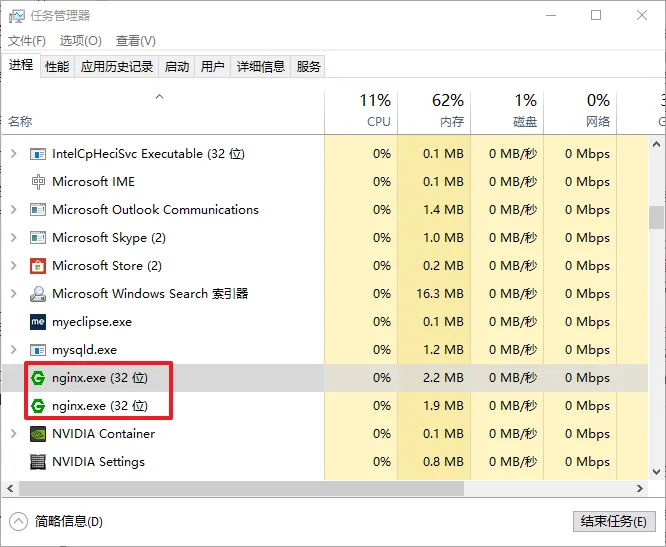 4、我们会看到一个窗口一闪而过。此时我们打开任务管理器,可以看到两个nginx.exe在那里运行着,这说明我们已经启动了。