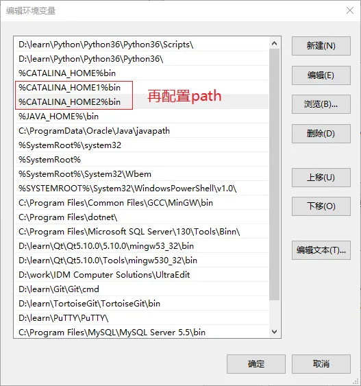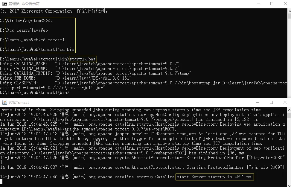 5、然后cmd分别进入tomcat1和tomcat2的安装目录下/bin,运行startup.bat。 -