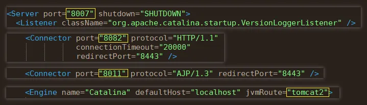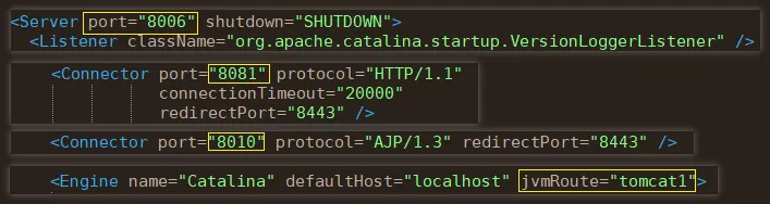 4、需要将tomcat带有端口号的地方改成不同的端口即可,分别打开两个tomcat的安装目录下conf下的server.xmltomcat1/conf/server.xml中的文件修改如下: