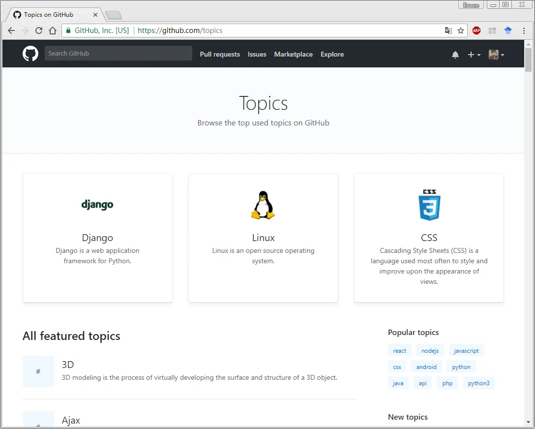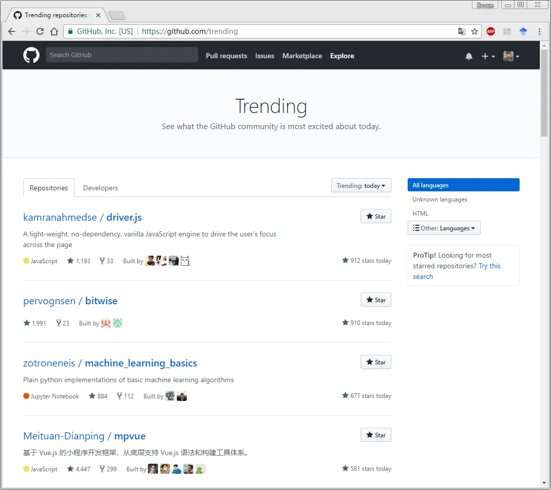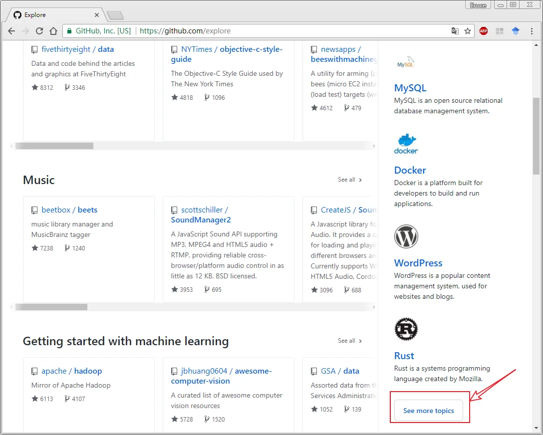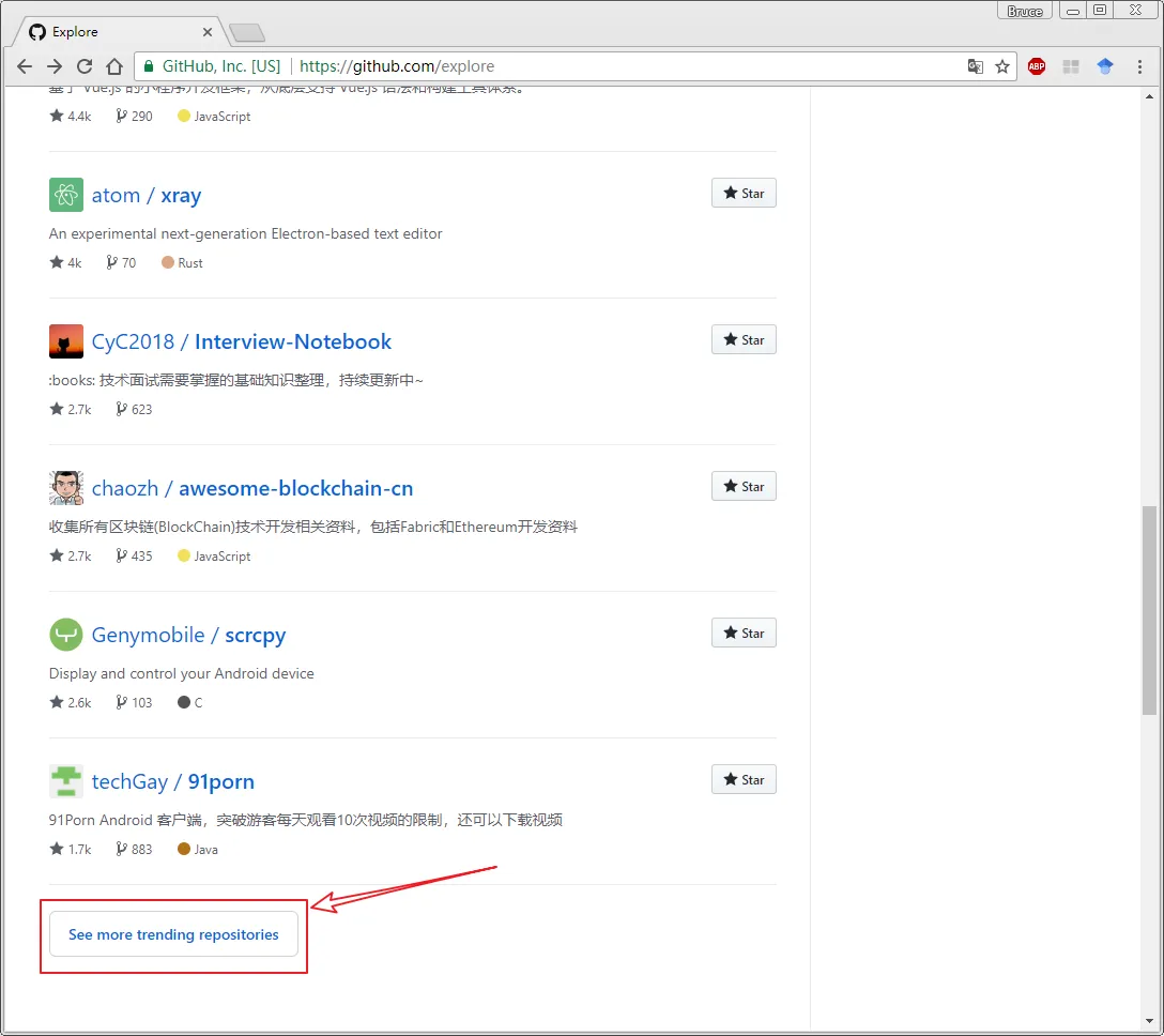 法一:在github网站的主面板找到 Explore 选项卡 --> See more topics(查看更多主题) 或者 See more trending repositories(产看更多趋势库)。