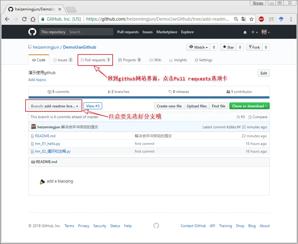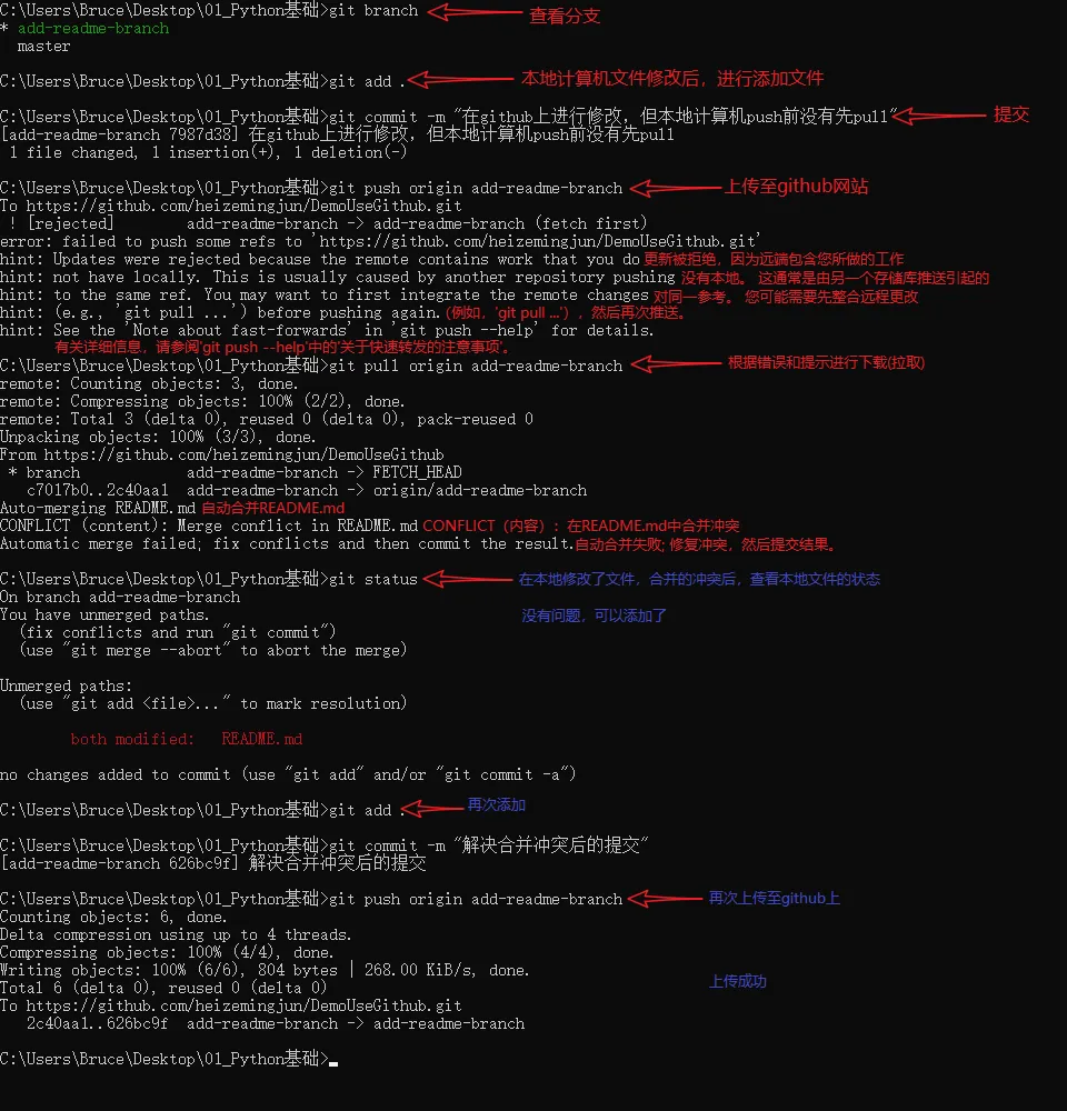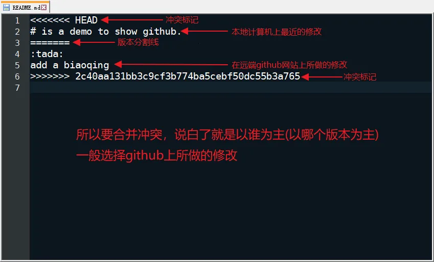 演示:在github网站上提交更改以及在本地计算机副本上提交更改来故意创建一个文件冲突并解决。