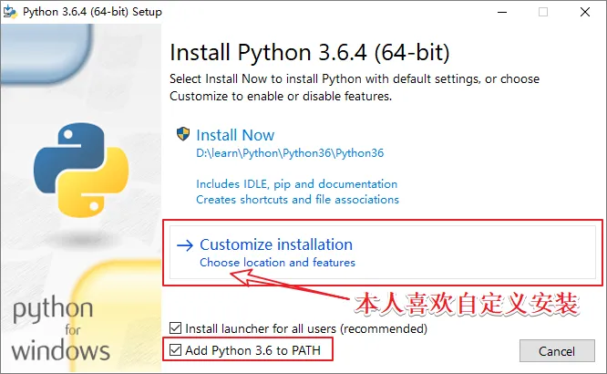 3、32位和64位的版本安装起来没有区别,双击打开后,第一步要记得勾上Add python to Path 选项,意思是把Python的安装路径添加到系统环境变量的Path变量中。然后选择自定义安装路径,也可以默认装C盘也可以,本人不喜欢默认安装,喜欢装在别的盘符!