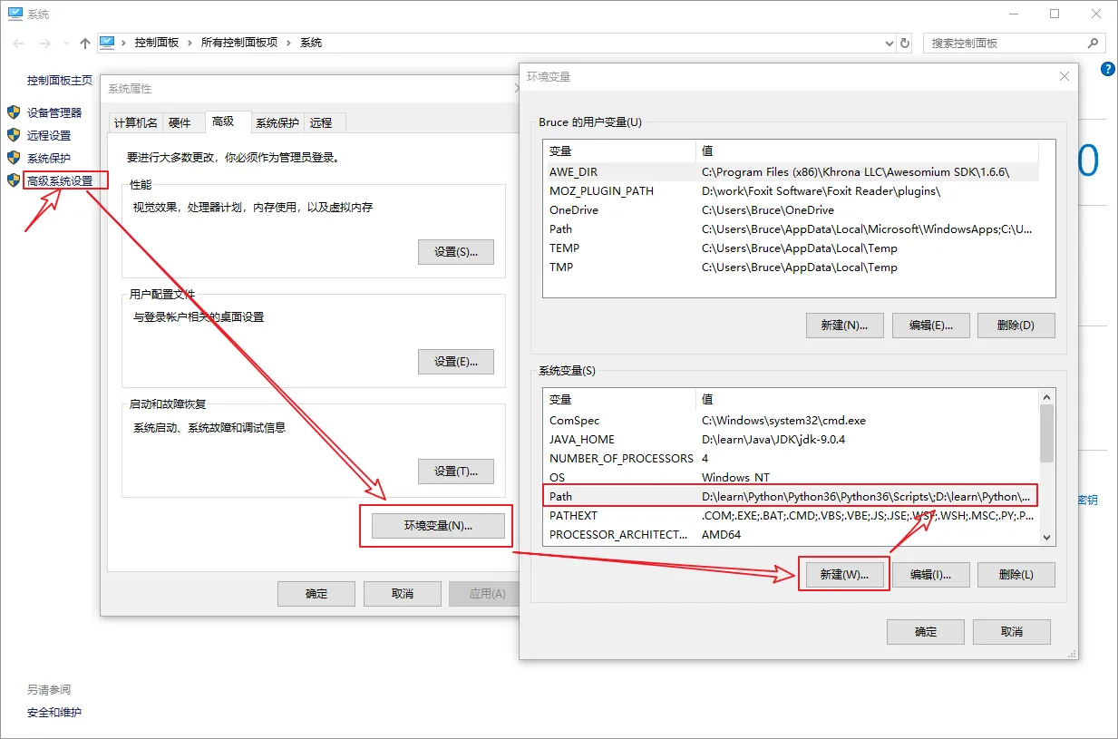 10、手动添加Python的环境变量,鼠标右键 此电脑 --> 属性 --> 点击高级系统设置 --> 点击环境变量 --> 点击PATH --> 在最后面加上我们的Python安装路径 --> 点击确定。如下图所示: