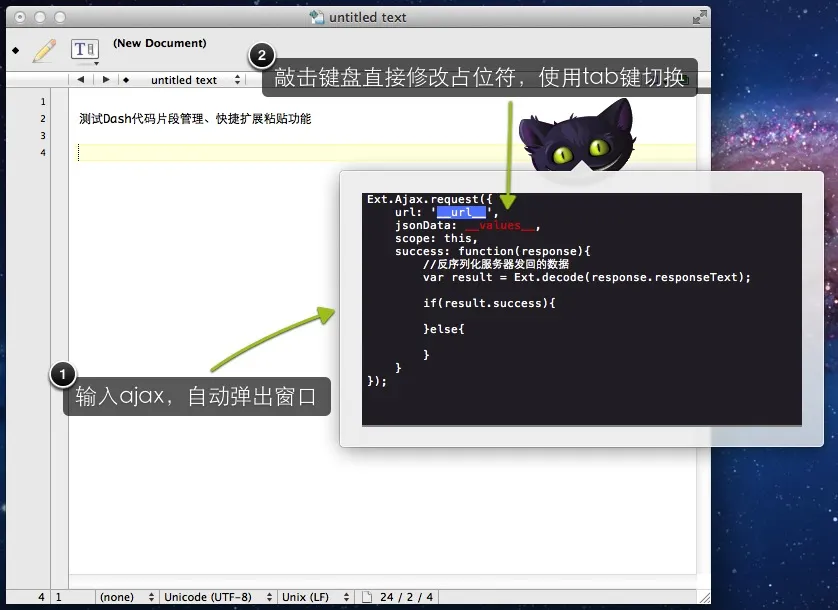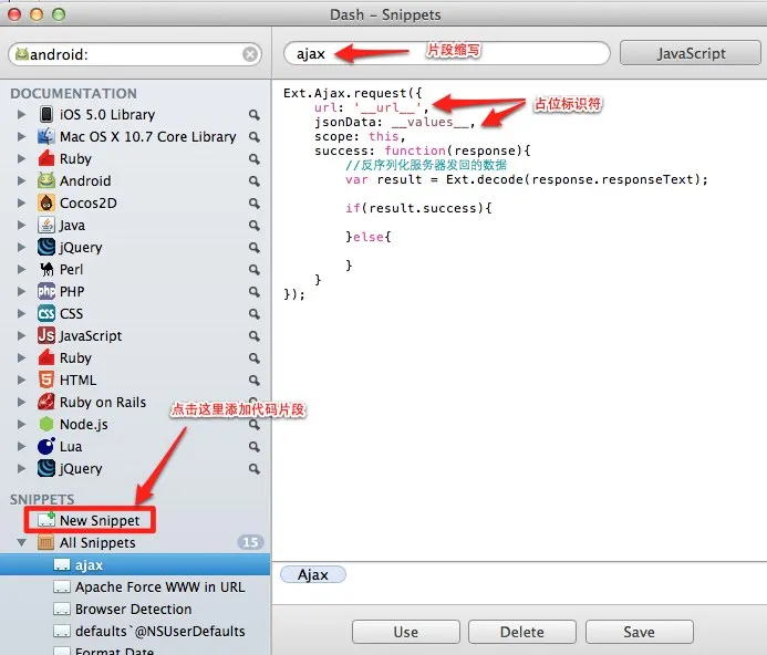 利用Dash的代码片段管理功能,我们可以把日常使用频繁(也就是你经常需要复制粘贴)的代码保存起来,然后为其设置一个独一无二的缩写,这样一来原本需要一遍又一遍的敲击键盘重复录入的繁琐工作,就可以交给Dash来帮你搞定啦。比如上面截图中的例子,就是ExtJS中发起Ajax请求的代码片段,哪怕是copy & paste,时间长了也会很烦的,我给它设置了一个缩写(ajax),以后在需要编写这段代码的时候,就只需要敲击这几个字母,它就会魔法般的出现在光标所在位置啦!很神奇吧?嘿嘿,其实这种扩展缩写的功能,还有很多软件都能做到,比如TextExpander(这个我也买了,半价14刀的时候,但是现在已经打入冷宫了,比较后悔),不过就用户体验和各种细节,诸如界面UI,特别是扩展占位符的处理上,目前还没有哪一个能比得过Dash的(Dash is the best!)。来看看使用代码片段的截图吧: