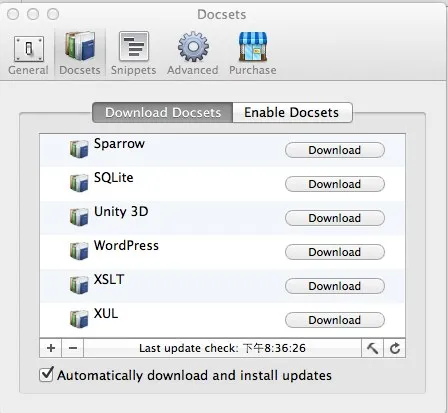 而且它的文档库采用了docset格式,高级用户基于网站提供的教程,很容易就能自行添加其他的扩充文档,其实Dash在最初发布的时候,只支持很少的几个文档浏览,好像只有Java、HTML、CSS这些,是后来通过用户不断贡献,以及作者及时的反馈(Rails API就是我通过Email与作者联系,请求添加的,作者非常nice),逐步壮大,才具备了如此广泛的语言、框架支持。要添加API文档,打开软件配置界面,切换到Docset选项卡即可看到所有内置的文档列表,按需要自行下载即可(如果是自己制作的docset,双击即可导入Dash):