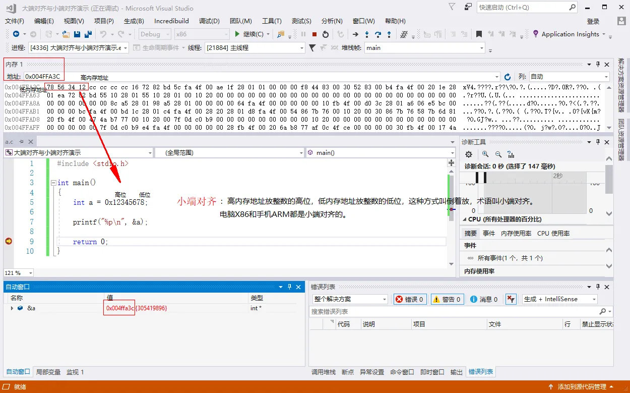 定义一个int类型的变量a,在VS2017下可以看到其在内存中的排列方式如下: