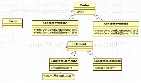 Visitor模式(访问者模式):在不改变原有类结构的基础上不断添加新的功能。缺点:破坏了封装性;Concretement扩展困难:每添加一个Element的子类,就要修改Visitor的接口,使得可以提供给这个新增加的子类的访问机制。