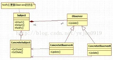 Observer模式(观察者模式):Observer模式定义对象间的一对多的依赖关系,当一个对象的状态发生改变时, 所有依赖于它的对象都得到通知并被自动更新。(如视图-文档)