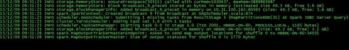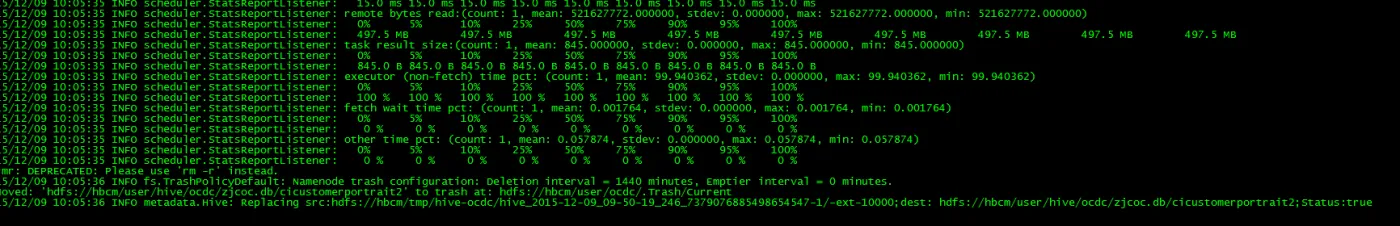 最终将生成好的文件拷贝到目录下,整个耗时10多分钟。Spark beeline方式连接有个缺陷,如果你一个job执行的时间过长,就会卡在那里,即便执行完也卡在那里,这样项目中用jdbc连接的时候,程序也不会退出,一直等待着结束,造成程序无法继续向下执行。这个还要调整各方面参数想办法优化执行效率。