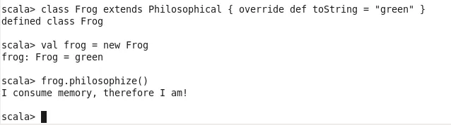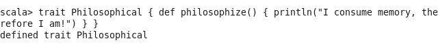 这个特质名为Philosophical。它没有声明超类,因此和类一样,有个缺省的超类AnyRef。它定义了一个方法,叫做philosophize,具体的。这是个简单的特质,仅够说明特质如何工作。一旦特质被定义了,就可以使用extends或with关键字,把它混入到类中。下列这种情况下隐式地继承了特质的超类,从特质继承的方法可以像从超类继承的方法那样使用。