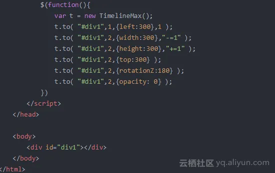 在这个例子中,等待1s后,元素"#div1"的left和width同时变化,left用时1s后到达目标点,width用时2s到达目标点,过1s钟高度开始变化,高度到达目标点后(用时2s),元素围绕z轴旋转180deg(用时2s),旋转后,透明度发生变化(用时2s)