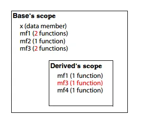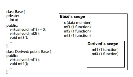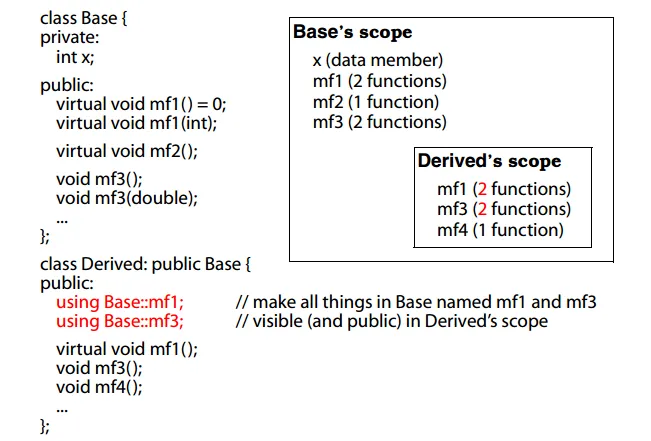 1 class Base { 2 private: 3 int x; 4 public: 5 virtual void mf1() = 0; 6 virtual void mf1(int); 7 virtual void mf2(); 8 void mf3(); 9 void mf3(double); 10 ... 11 }; 12 class Derived: public Base { 13 public: 14 virtual void mf1(); 15 void mf3(); 16 void mf4(); 17 ... 18 };