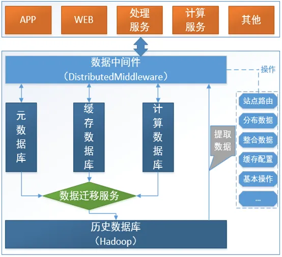 数据库中间件是数据存储、处理的核心部分,现在集成了业务数据和离散数据的管理和操作,在底层数据存储包括元数据库、缓存数据库、计算数据库和历史数据库,相互之间通这数据迁移服务进行总体协调。中间件统一提供操作接口,供业务端的调用。