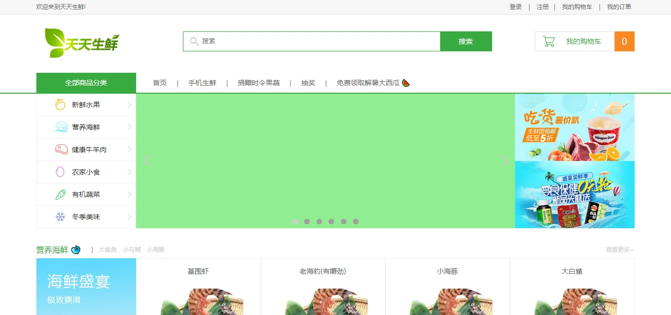 <!DOCTYPE html> <html lang="en"> <head> <meta charset="UTF-8"> <meta name="viewport" content="width=device-width, initial-scale=1.0"> <meta http-equiv="X-UA-Compatible" content="ie=edge"> <title>天天生鲜</title> <link rel="stylesheet" href="css/reset.css"> <link rel="stylesheet" href="css/main.css"> </head> <body> <!--1.登录部分login 欢迎来到天天生鲜!--> <!--1.1 最外层的div--> <div class="login"> <!--1.2 内层内容--> <div class="login-content"> <!--1.3 天天生鲜 h2--> <h2 class="lf">欢迎来到天天生鲜!</h2> <!--1.4 登录--> <div class="login-right rf"> <!--<1.4.1已经登录部分div--> <div class="logined lf"> 欢迎您: <a href="">张三</a> </div> <!--<1.4.2未登录部分div--> <div class="unlogin lf"> <a href="">登录</a> <span>|</span> <a href="">注册</a> </div> <!--<1.4.3 我的订单div--> <div class="myorder lf"> <span>|</span> <a href="">我的购物车</a> <span>|</span> <a href="">我的订单</a> </div> </div> </div> </div> <!--2.search部分--> <!--<2.1外层的div--> <div class="search"> <!--2.2内部的内容div--> <div class="search-content"> <!--2.2.1-logo--> <a class="logo lf" href=""> <img src="images/logo.png" alt="天天生鲜的图片" title="天天生鲜logo"> </a> <!--2.2.2搜索框 searchbar--> <div class="searchbar lf"> <form action=""> <!--2.2.2.1文本输入框--> <input type="text" placeholder="搜索" class="searchtext lf"> <!--2.2.2.2按钮--> <input type="submit" value="搜索" class="searchtbtn lf"> </form> </div> <!--2.2.3我的购物车--> <div class="mycar rf"> <a href="">我的购物车</a> <span>0</span> </div> </div> </div> <!--3. 全部商品 category--> <div class="category"> <div class="category-content"> <!--3.1全部商品分类--> <h3>全部商品分类</h3> <!--3.2首页--> <ul> <li> <a href="">首页</a> </li> <li> <span>|</span> </li> <li> <a href="">手机生鲜</a> </li> <li> <span>|</span> </li> <li> <a href="">捐赠时令果蔬</a> </li> <li> <span>|</span> </li> <li> <a href="">抽奖</a> </li> <li> <span>|</span> </li> <li> <a href="">免费领取解暑大西瓜 </a> </li> </ul> </div> </div> <!--4.slider轮播图--> <div class="slider"> <div class="slider-content"> <!--4.1左侧分类列表--> <ul class="categorylist lf"> <li> <a href="">新鲜水果</a> </li> <li> <a href="">营养海鲜</a> </li> <li> <a href=""> 健康牛羊肉</a> </li> <li> <a href="">农家小食</a> </li> <li> <a href="">有机蔬菜</a> </li> <li> <a href="">冬季美味</a> </li> </ul> <!--4.2中间的轮播图--> <div class="middleslider lf"> <!--4.2.1 内部的6张图片--> <ul class="sliderimage"> <li> <a href=""> <!-- <img src="images/slider.jpg" alt="轮播图1"> --> </a> </li> <li> <a href=""> <!-- <img src="images/slider.jpg" alt="轮播图1"> --> </a> </li> <li> <a href=""> <!-- <img src="images/slider.jpg" alt="轮播图1"> --> </a> </li> <li> <a href=""> <!-- <img src="images/slider.jpg" alt="轮播图1"> --> </a> </li> <li> <a href=""> <!-- <img src="images/slider.jpg" alt="轮播图1"> --> </a> </li> <li> <a href=""> <!-- <img src="images/slider.jpg" alt="轮播图1"> --> </a> </li> </ul> <!--4.2.2左右箭头--> <div class="leftarrow"></div> <div class="rightarrow"></div> <!--4.2.3小圆点--> <ul class="points"> <li class="active"></li> <li></li> <li></li> <li></li> <li></li> <li></li> </ul> </div> <!--4.3ad广告部分--> <div class="ad"> <a href=""> <img src="images/pic01.jpg" alt="广告1"> </a> <a href=""> <img src="images/pic02.jpg" alt="广告2"> </a> </div> </div> </div> <!--5.foods 商品详情--> <div class="foods"> <div class="foods-content"> <!--5.1title--> <div class="foodstitle"> <h5>营养海鲜 </h5> <ul class="titlelist"> <li> <span>|</span> </li> <li> <a href="">大鲨鱼</a> </li> <li> <a href="">小乌贼</a> </li> <li> <a href="">小海豚</a> </li> </ul> <a href="" class="more">查看更多></a> </div> <!--5.2左侧图片--> <div class="foodpic"> <a href=""> <img src="images/fresh.jpg" alt="海鲜图"> </a> </div> <!--5.3右侧商品详情--> <ul class="fooddetail"> <li> <h5>基围虾</h5> <a href=""> <img src="images/foods.jpg" alt="基围虾"> </a> <div>¥ 35</div> </li> <li> <h5>老海豹(有嚼劲)</h5> <a href=""> <img src="images/foods.jpg" alt="老海豹(有嚼劲)"> </a> <div>¥ 35</div> </li> <li> <h5>小海豚</h5> <a href=""> <img src="images/foods.jpg" alt="小海豚"> </a> <div>¥ 35</div> </li> <li> <h5>大白鲨</h5> <a href=""> <img src="images/foods.jpg" alt="大白鲨"> </a> <div>¥ 35</div> </li> </ul> </div> </div> <!--5.foods 商品详情--> <div class="foods"> <div class="foods-content"> <!--5.1title--> <div class="foodstitle"> <h5>新鲜水果 </h5> <ul class="titlelist"> <li> <span>|</span> </li> <li> <a href="">芒果</a> </li> <li> <a href="">加州提子</a> </li> <li> <a href="">亚马孙牛油果</a> </li> </ul> <a href="" class="more">查看更多></a> </div> <!--5.2左侧图片--> <div class="foodpic"> <a href=""> <img src="images/friut.jpg" alt="水果图"> </a> </div> <!--5.3右侧商品详情--> <ul class="fooddetail"> <li> <h5>芒果</h5> <a href=""> <img src="images/foods.jpg" alt="芒果"> </a> <div>¥ 35</div> </li> <li> <h5>牛油果</h5> <a href=""> <img src="images/foods.jpg" alt="牛油果"> </a> <div>¥ 35</div> </li> <li> <h5>西班牙大西瓜</h5> <a href=""> <img src="images/foods.jpg" alt="西班牙大西瓜"> </a> <div>¥ 35</div> </li> <li> <h5>马尔代夫大菠萝</h5> <a href=""> <img src="images/foods.jpg" alt="马尔代夫大菠萝"> </a> <div>¥ 35</div> </li> </ul> </div> </div> <!--5.foods 商品详情--> <div class="foods"> <div class="foods-content"> <!--5.1title--> <div class="foodstitle"> <h5>绿色蔬菜</h5> <ul class="titlelist"> <li> <span>|</span> </li> <li> <a href="">西红柿</a> </li> <li> <a href="">红辣椒</a> </li> <li> <a href="">大黄瓜</a> </li> </ul> <a href="" class="more">查看更多></a> </div> <!--5.2左侧图片--> <div class="foodpic"> <a href=""> <img src="images/capate.jpg" alt="蔬菜图"> </a> <