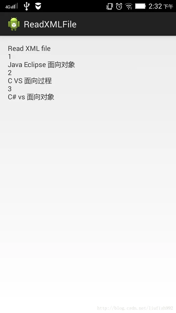 读取XML中存储的数据。将xmlfile.xml存放在assets文件夹中。在activity_main.xml中创建一个textview,用来显示读取到的数据。