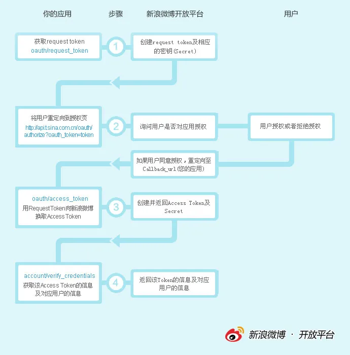 下面新浪微博OAuth的基本流程(其实各平台的流程都一样,贴这个是觉得这张图比较好看):