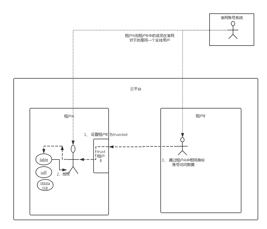 当项目空间有类似上下级关系时,MaxCompute还提供了一种更加方便的跨租户授权方式-Trusted。下级项目空间A可以完全信任上级项目空间B中的用户时,项目空间A可以把项目空间B加为trusted。此时如果组织内的用户张三同时加入到项目空间A和B中。那么张三在项目空间B中就可以访问在项目空间A中授权过的资源。