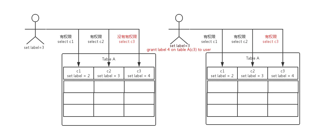 为方便这种细粒度访问控制的管理,labelsecurity的权限管理采用了多级安全管理模型。如图4,租户的管理者根据机密等级给用户和表的字段设置label。用户不需要label授权就可以访问比自己label低的字段。但是如果需要访问比自己label高的字段就需要授权