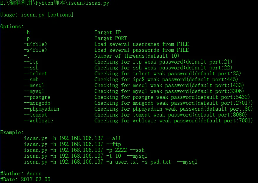 亲手打造了一款弱口令检测工具,用Python编写,主要可以用于内网渗透、弱口令检测等方面,目前集成了常见端口服务,包含