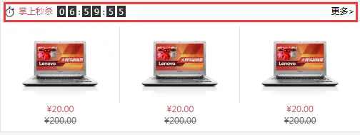 1 <div class="jd_secKill_left"> 2 <span class="ms_icon"></span> 3 <h4 class="ms_name fl">掌上秒杀</h4> 4 <div class="ms_time fl"> 5 <span class="num fl">0</span> 6 <span class="num fl">0</span> 7 <span class="str fl">:</span> 8 <span class="num fl">0</span> 9 <span class="num fl">0</span> 10 <span class="str fl">:</span> 11 <span class="num fl">0</span> 12 <span class="num fl">0</span> 13 </div> 14 </div> 15 <div class="jd_secKill_right fr"> 16 <a href="">更多></a> 17 </div>